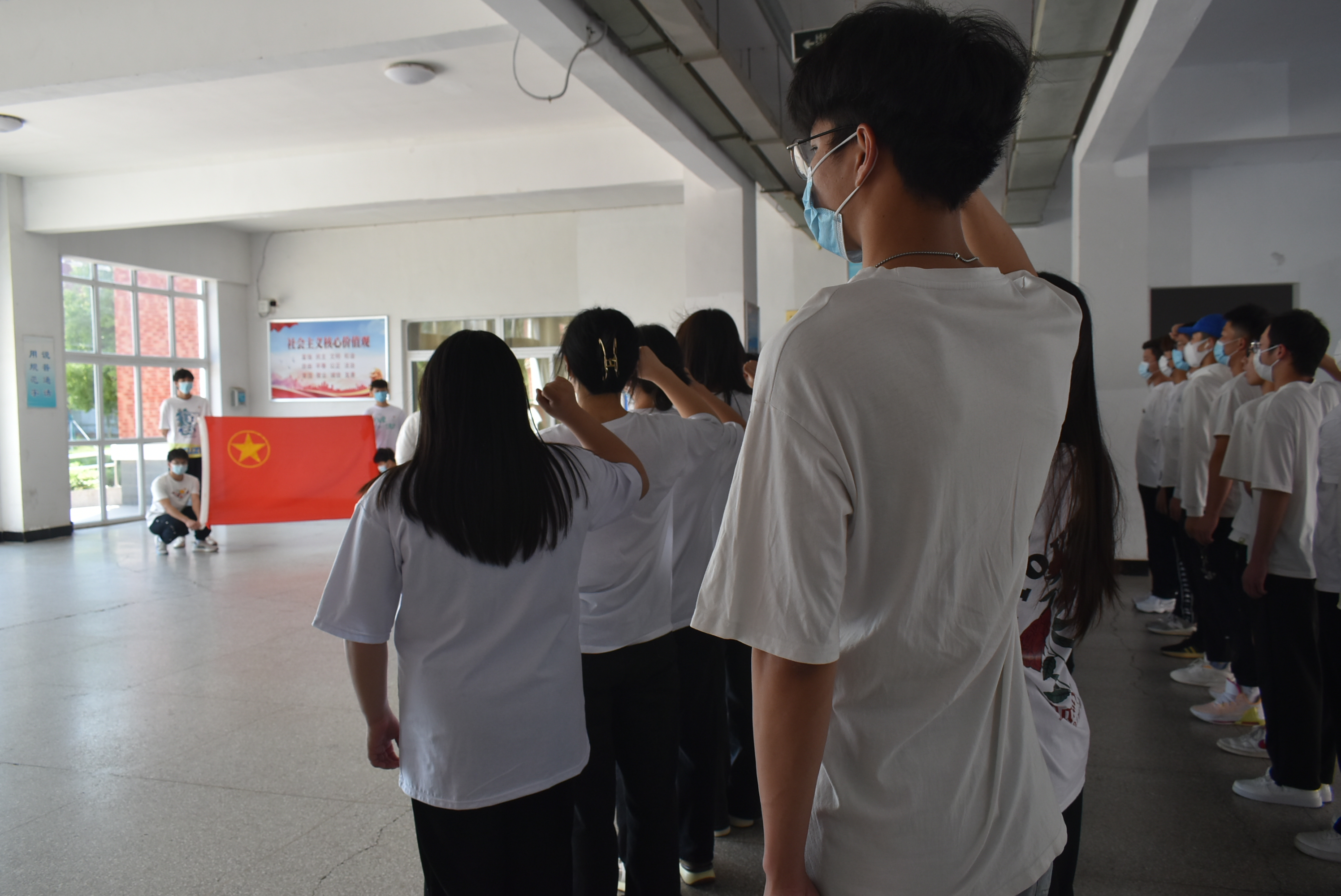 活动伊始,刘许诺同学介绍了活动流程和活动内容,重温入团誓词,唱响青春团歌。在杨苗苗同学的带领下,全体团员佩戴团徽,高举右拳,表情庄严肃穆,面向团旗庄严宣誓。随后,团员代表陈星带领全体团员共同唱响《光荣啊,中国共青团》——“我们是五月的花海,用青春拥抱时代;我们是初升的太阳,用生命点燃未来…”教学楼回荡着的团歌嘹亮,使全体团员接受了一次深刻的思想教育和精神洗礼。