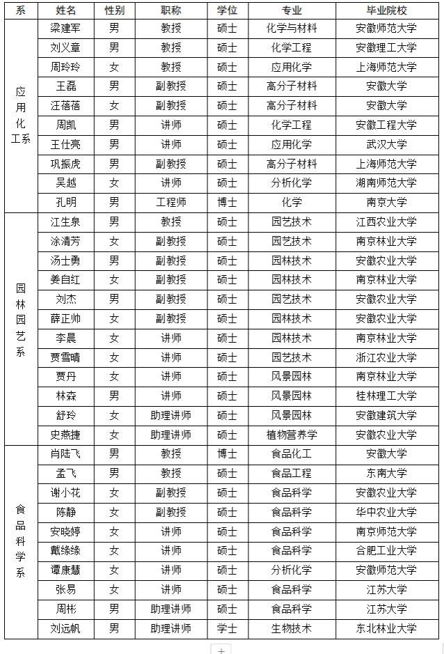 学院历史 食品与环境工程学院的前身为2003年成立的基础部化工教研室,2012年3月成立了生化工程系,2014年4月,更名为食品与环境工程系,2019年8月更名为食品与环境工程学院。 学院简介 食品与环境工程学院辖三个系和一个省级示范实验实训中心,分别是:应用化工系、园林园艺系、食品科学系和生化实训中心。共开设6个专业:应用化工技术(中央财政支持重点建设专业)、环境工程技术、园林技术、园林工程技术、绿色食品生产技术、食品检验检测技术。有教职工36人,其中教授7人,副教授10人,讲师14人,高级双师型教师11人、高级技师9人,技师8人;硕士28人,博士2人;省级教学名师6人,省级教坛新秀5人,省级专业带头人2人,师资力量十分雄厚。 近年来,食品与环境工程学院在师资队伍建设、人才培养、专业建设、教育教学改革、技能大赛等方面取得了突出的成绩:拥有中央财政支持重点建设专业1个;创新发展行动计划骨干专业1个、省级特色专业2个;建有省级滁菊大师工作室、省级特派员工作站、省级校内生产性实训基地等;出版专著5部;省级示范实验实训中心1个;省级教学研究项目4项;省级教学团队1项;省级自然科学研究重大项目6项、重点项目18项;省级拔尖人才2人、省级优秀青年人才支持计划重点项目9项;国家级职业技能大赛二等奖7项、三等奖7项,省级职业技能大赛二等奖、三等奖多项等。 目前,学院的毕业生始终供不应求,培养的学生一直受用人单位青睐,就业率连续10年始终保持在100%。 食品与环境工程学院师资队伍一览表(专业教师): (2025年3月25日更新) |