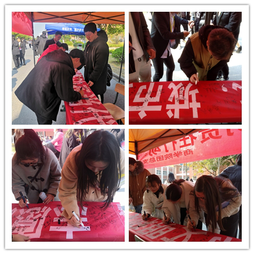 本次活动,商学院团总支组织志愿者在宿舍前主要路段设置志愿者服务站,以横幅签字为主要形式开展宣传活动,号召大家围绕创建文明城市要求,从自身做起,说文明话、办文明事、做文明人,让创文氛围感染群众,让创建文明城市意识深入人心。横幅签名活动也得到了同学们的大力支持,纷纷前来在“志愿服务功在当代,城市文明利及千秋”的红色横幅上留下了自己的姓名,感受到了同学们对创建文明城市的信心与决心。