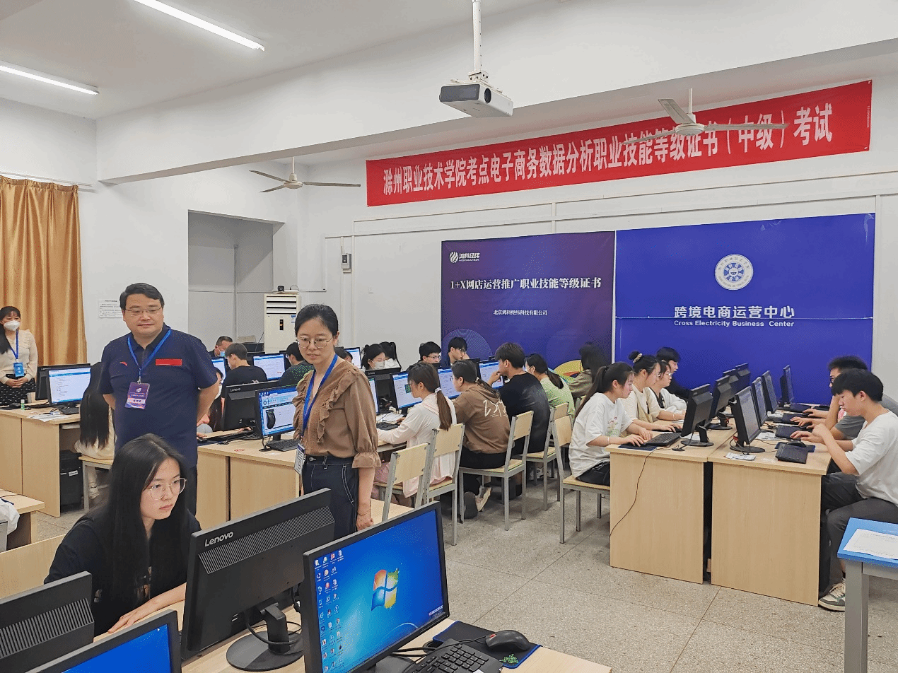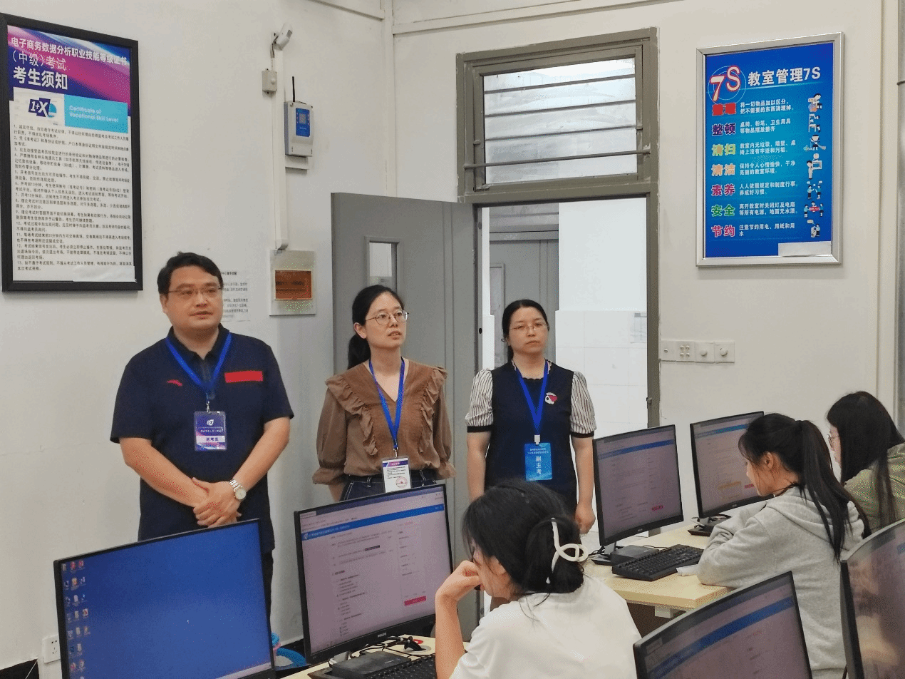 为贯彻落实《国家职业教育改革实施方案》中“1+X”证书制度试点工作的要求,加快推进awc官网课证融通教学改革实践。根据考务工作安排,2023年5月27日,商学院在致真楼1228、1231机房举行了“1+X”电子商务数据分析职业技能等级证书(中级)考试。商学院党总支副书记李晓辕、商学院副院长许正环、滁州城市职业学院管理学院书记陈兴旺到现场指导工作。商学院电子商务专业共80名学生参加本次认证考试。