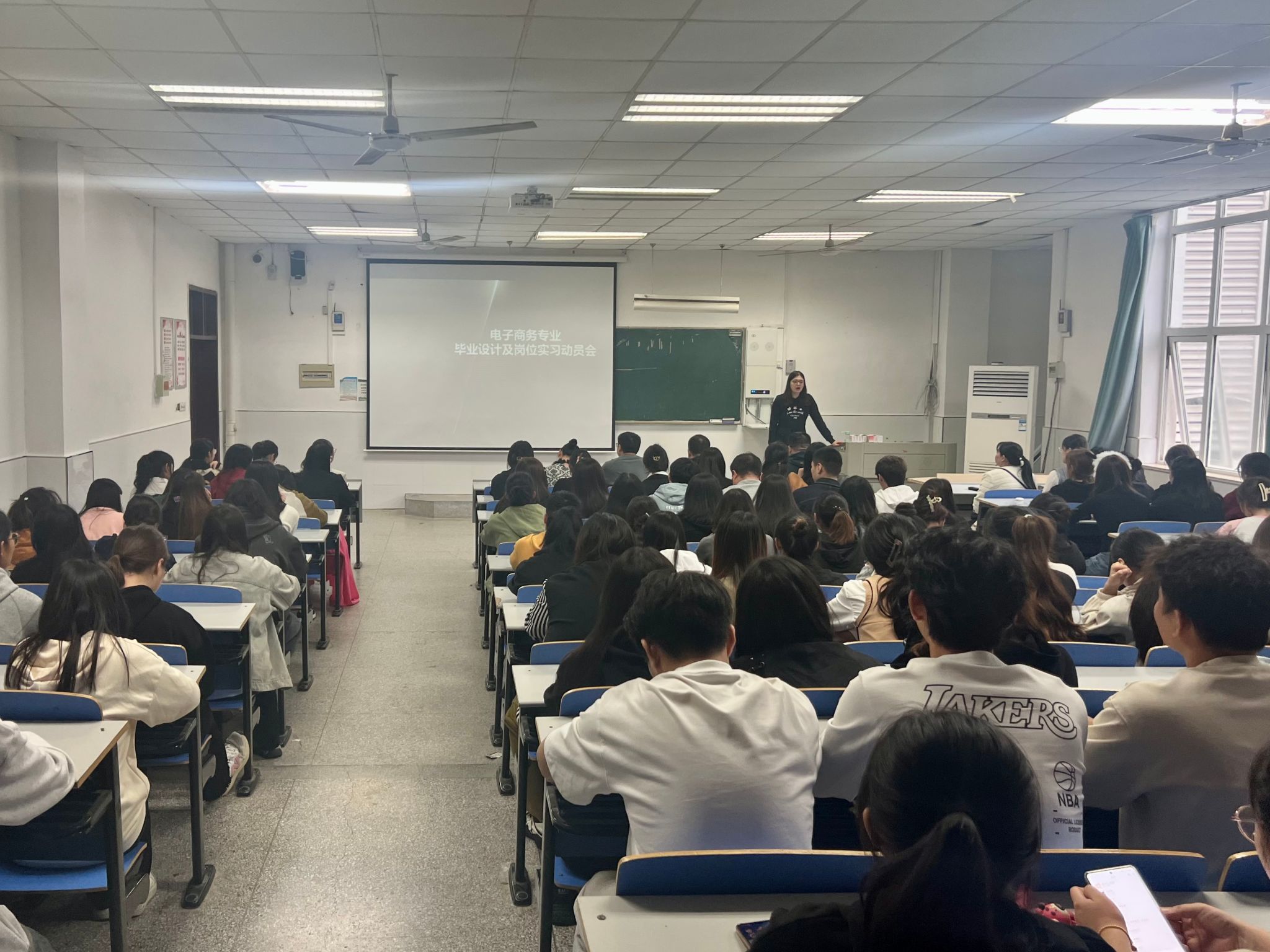 为引导2024届电子商务专业毕业生树立正确的择业就业观念,提高就业积极性和主动性,高质量推动就业工作,电子商务专业于2023年10月25日下午在1116教室召开2024届毕业生岗位实习动员大会,本次会议由电商专业负责人付则晨主持,商学院院长程震、电商教研室主任杨剑、电商专业教师、毕业班辅导员及全体毕业生参加。