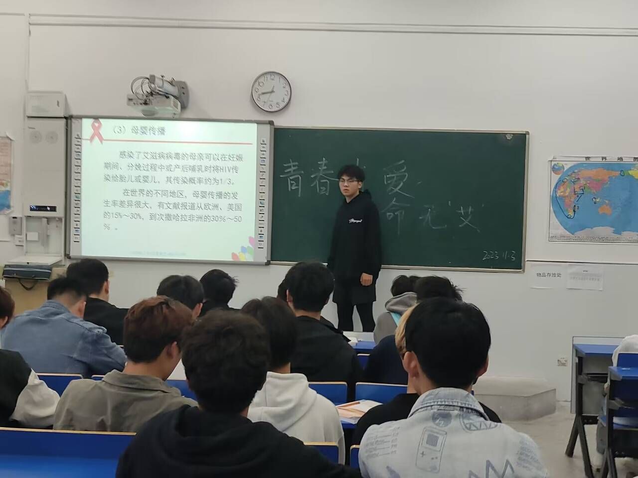 为进一步普及艾滋病防范知识,增强青年大学生自我保护意识和能力,商学院23级物流管理2班于11月3日在致真楼1204教室开展了防艾主题宣讲活动。本次活动由商学院23级物流2班邢付成同学带领学习。