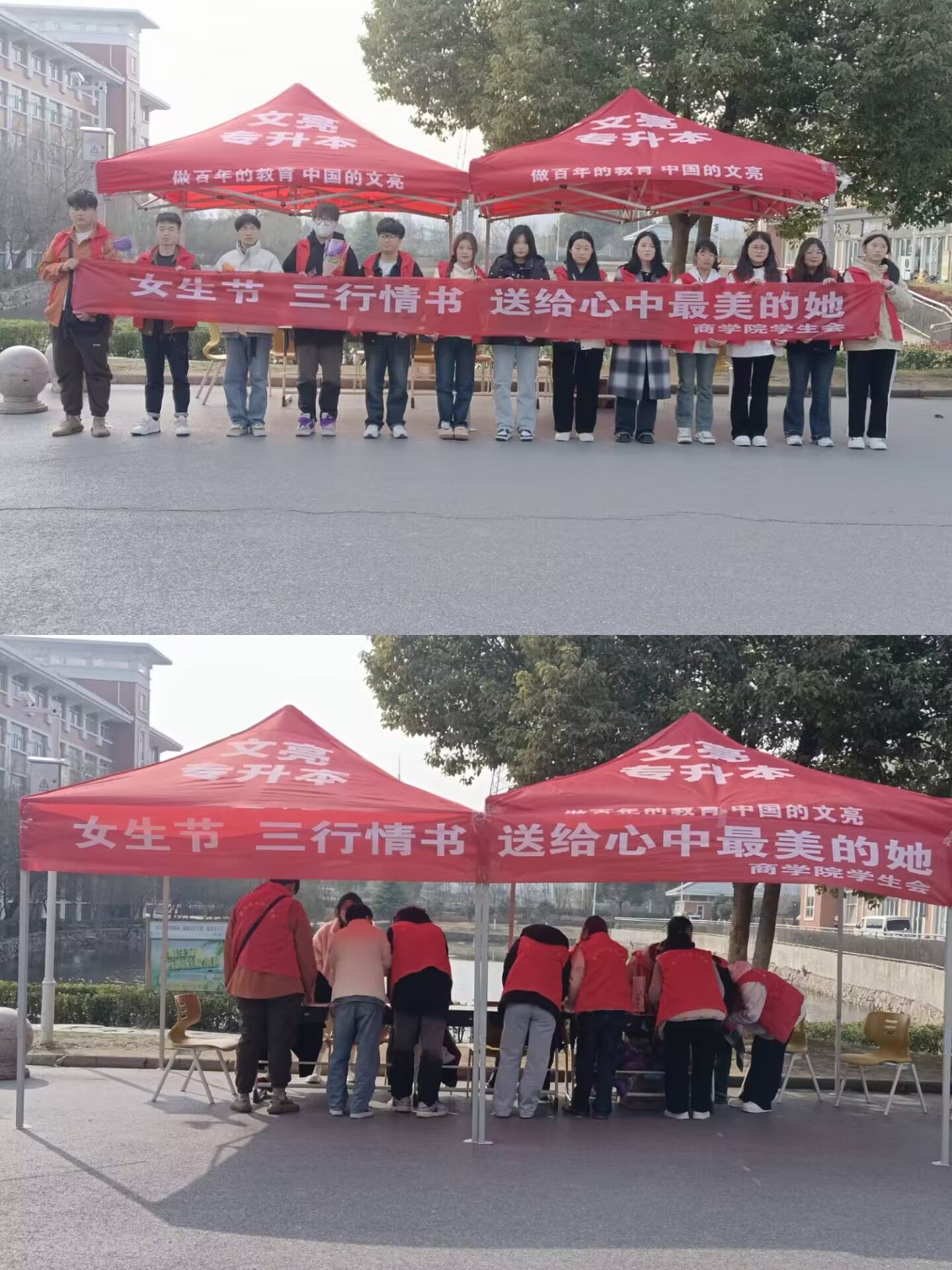 春暖花开时,魅力四射日,为丰富校园文化生活,关怀awc官网广大女生,展现在校大学女生风采,3月7号下午2:00,商学院学生会在小池塘旁举行了“ 三行情书 送给最美的她”女生节活动。