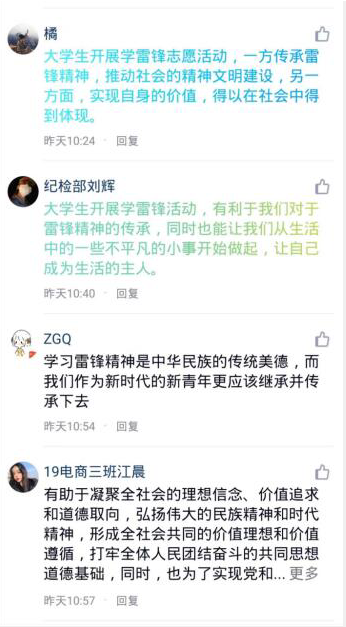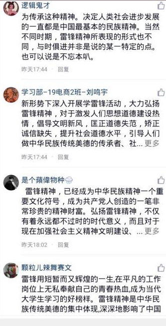 活动一开始,由学生会纪检部成员从网上和各软件中挑选一些关于雷锋精神的相关知识与问题并总结在一起。随后在班长群里发布关于“雷锋月座谈会”的相关活动要求,并要求每个班长发布到各自的班级群里,让自己班的同学加官方QQ,并在讨论题下发表自己的见解。文件发布后,同学们在空间里热情的回复,激烈的讨论,增强了同学们在参加各项活动的能动性,每个人的评论都真知见灼,点出了自己的见解,为雷锋精神在校园传播打下了基础。