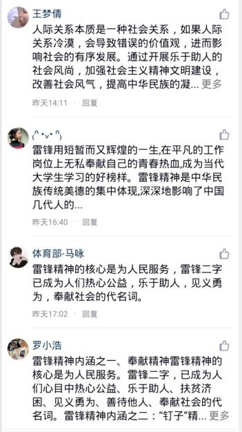 1963年3月5日,毛泽东主席发出了向‘雷锋同志学习’的伟大号召。57年来,雷锋精神已经深深扎根于人民群众的思想之中。雷锋已经成为真情与爱心的化身,成为时代的楷模,成为我们社会衡量道德行为的标准。因此,我院学生会纪检部于3月25日开展“雷锋月座谈会”线上讨论活动。