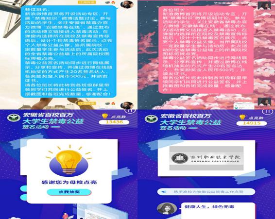 百万大学生禁毒公益签名活动通过新浪微博开展,商学院全体同学秉承着为母校增光,为大学添彩的原则。在班长的组织带领下,每日都积极主动为母校点亮,争取校徽在全省禁毒公益墙上的排名越来越高,为禁毒事业贡献出自己的力量。此次签名活动,大力弘扬禁毒公益人人参与的精神,进一步增强同学们参与禁毒斗争的责任感、使命感,营造出了浓厚的禁毒宣传教育氛围。