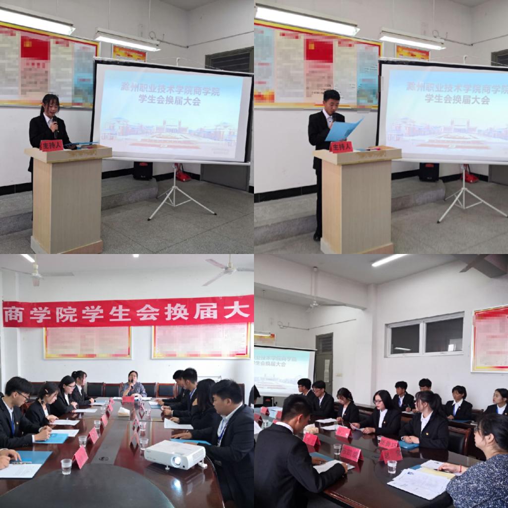本次换届大会在主持人声情并茂的开场词下拉开了帷幕。商学院团总支副书记赵莹老师对此次会议做了开场发言,表示对学生会寄予重望,希望同学们扎扎实实的开展工作,用自己的实际行动来证明自己。接着由学生会主席张贵巧、副主席陈凯旋发表离职感言,其中包含了对过去学生会工作的回想,以及对下一届学生会干事的期望。随后,商学院学生会主席团以及各部门新任部长与副部长发表竞选感言,每位选手都自信地走上演讲台,就各自的基本情况、对工作岗位的认识、竞选原因以及工作设想进行了演讲,他们语言自然流畅,仪态端庄大方。有的畅谈自身丰富的学生工作经验;有的充分展示自己在某方面的特长;有的该谐幽默,给人以深刻印象;有的言语犀利,令人肃然起敬。慷慨激昂的竞选演讲,将此次竞选活动一次次推向高潮。他们希望最终能当选的学生会干部,扎扎实实地开展工作,使我们的学生工作更有成效、更有特色,希望全体同学真心实意地支持学生会干部的工作,相信经过大家的共同努力,我学部的学生工作一定会再上一个新台阶。会议的最后,学生会全体成员一起合影留念。