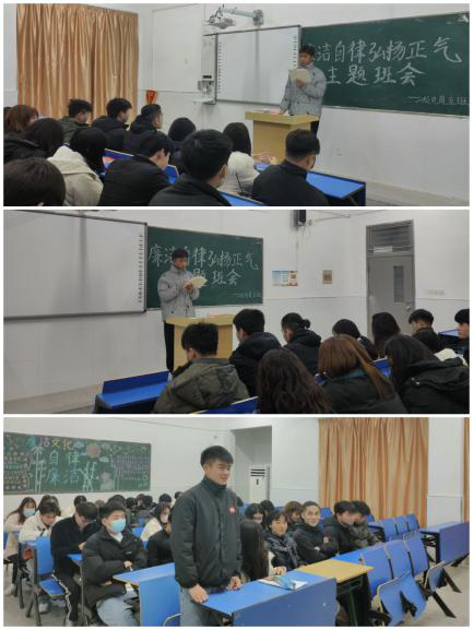 为深入开展“廉洁自律,弘扬正气”宣传教育活动,让学生养成节约、诚信、礼让、自律的品德,商学院学生会于11月27日辅助各班班长开展了“廉洁自律,弘扬正气”主题班会活动,班级辅导员负责指导。