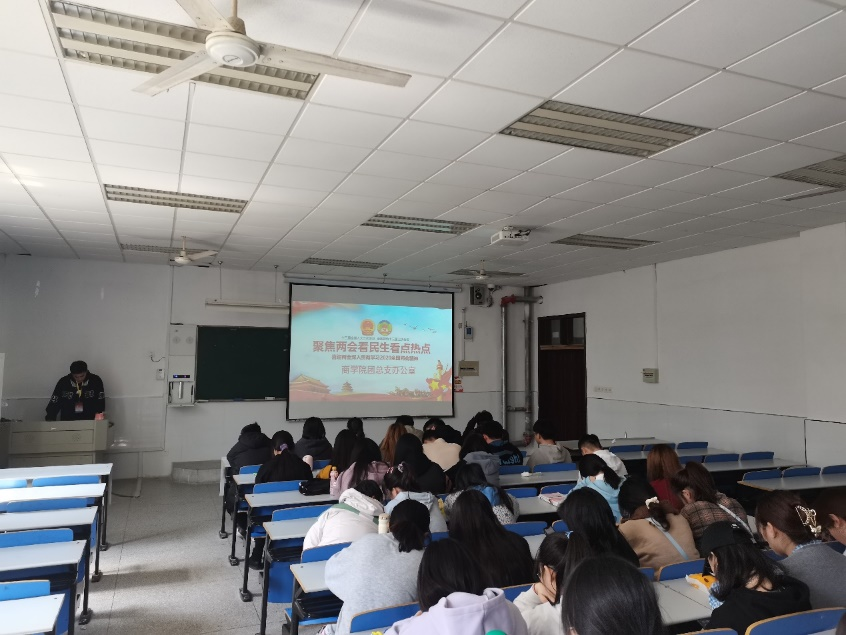商学院团总支办公室于3月24日中午在1119教室举办了“聚焦两会,看民生看热点”座谈会,本次活动由团总支办公室成员戴文强主持,19级和20级约40名同学参加了座谈会。