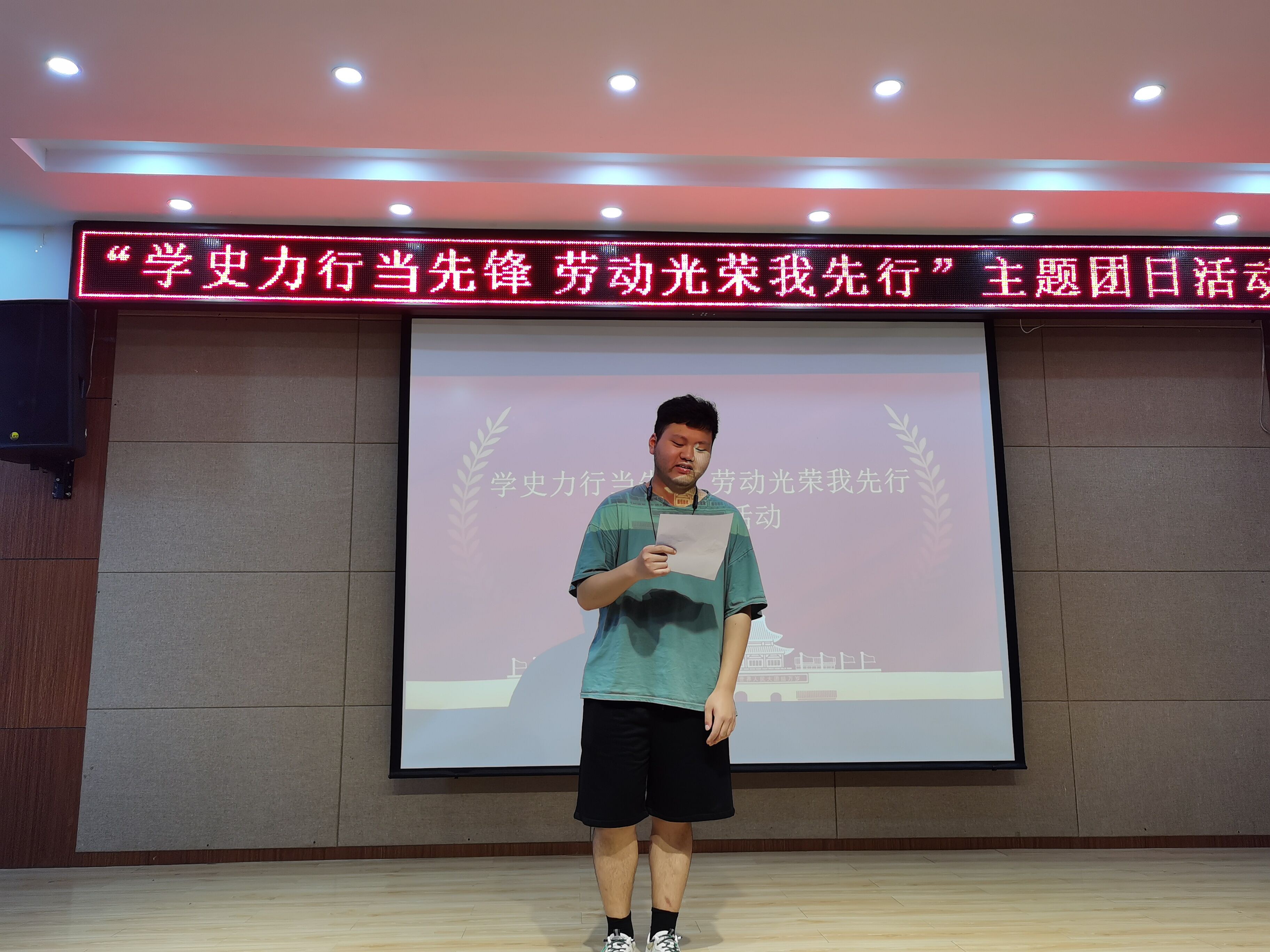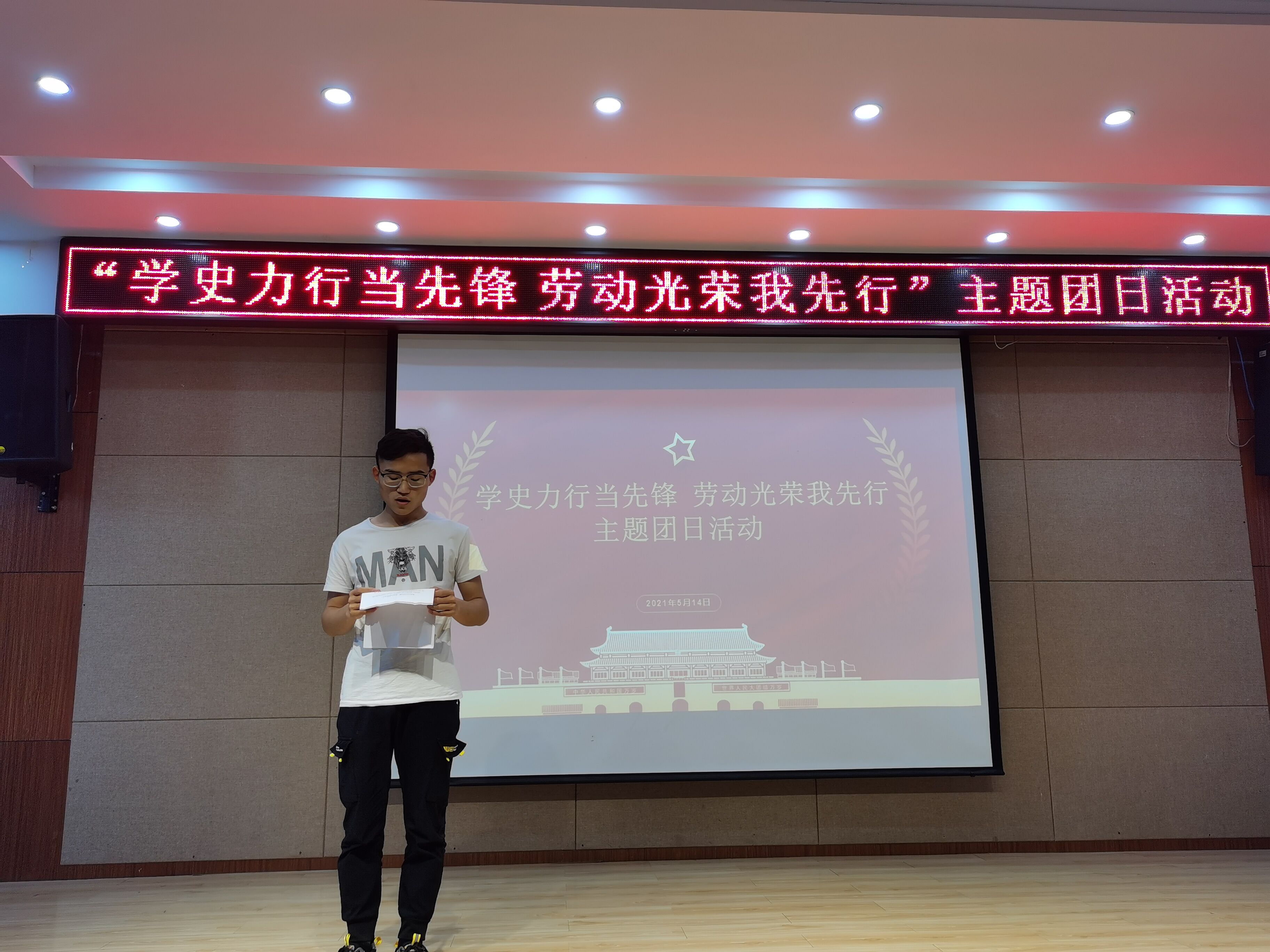 在辅导员朱婷婷的带领下,3位同学在讲台上讲述了学习党史是叩问初心的回首,更是向史而新、续写华章的展望。致敬劳模是向内借鉴、精神传递的重温,更是汲取榜样力量、不断续写辉煌的期望。活动也对同学们进行了有关垃圾分类的教育。
