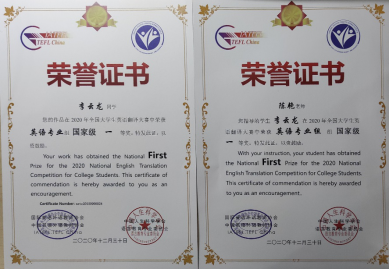 经过商学院商务英语教研室陈艳副教授的悉心指导,我院学子19商务英语班李云龙同学的译稿最终在4200余份专业组作品中脱颖而出,斩获英语专业组“国家级一等奖”!后期组委会将把荣获国家一等奖的作品集结成册,并在《英语辅导报》以及《考试与评价》等刊物上对获奖师生进行公开表彰。