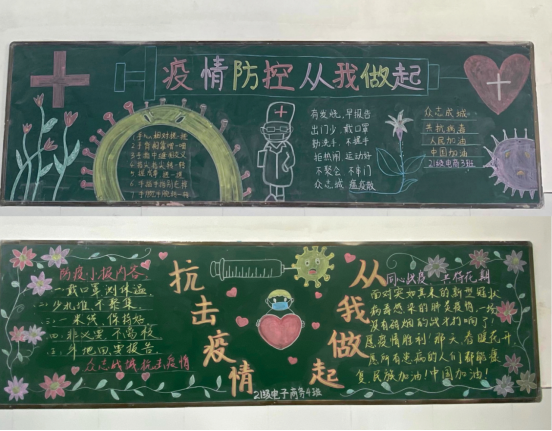 通过此次手抄报、黑板报的形式,多科普、多预防,既进一步了解了校园疫情防控的相关知识,而且展现了青年学生朝气蓬勃的风采;筑牢了同学们维护健康安全的防线,增强了同学们对疫情、生命、家国情怀的感知,也是一次有意义的爱国主义教育。