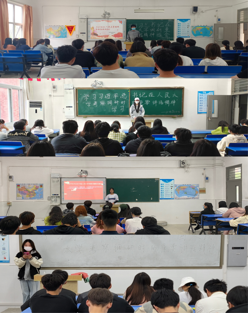 在五四青年节即将到来之际,习近平总书记4月25日上午到中国人民大学考察调研并发表重要讲话。商学院第一时间组织收听收看相关新闻报道,总书记的重要讲话精神在团支部书记中引发热议,大家纷纷记录下自己的感想与心得。随后各团支部于4月26日起陆续通过班会的形式带领支部团员开展“学习习近平总书记考察中国人民大学时的重要讲话精神”主题班会学习活动,进一步了增强同学们的思想意识、政治敏感度与团支部凝聚力。