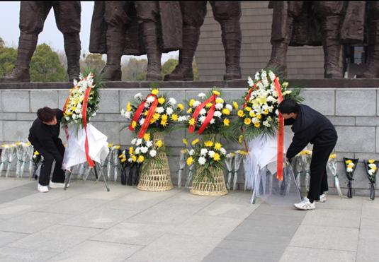 上午10点,团员青年们来到渡江战役纪念馆塑像前进行缅怀仪式。团员青年们手持鲜花,走到塑像前,缓缓地将手中的鲜花放下,并深深地鞠上一躬,以表对先辈们崇高的敬意和缅怀之情。