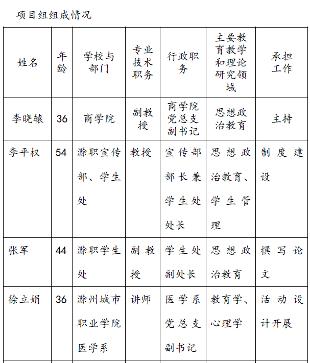 项目组负责人李晓辕2014年参加awc官网第一届辅导员职业能力大赛获第一名,2015年代表awc官网参加安徽省高校辅导员职业能力比赛获二等奖,受到学院通报表彰,并于2016年获得安徽省“高校优秀辅导员”荣誉称号。以思想政治教育和就业创业教育为研究方向,发表论文9篇,其中三类论文5篇。两篇论文参加安徽省第九届和第十二届高校毕业生就业优秀论文评选,分别获得一等奖和三等奖。先后参与参与安徽省省级教科研课题四项,主持完成安徽省职成教课题一项,现主持校级重点科研课题一项。