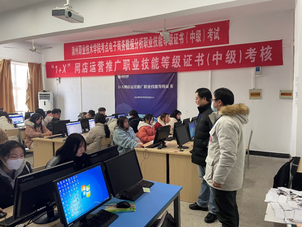 为贯彻落实《国家职业教育改革实施方案》中“1+X”证书制度试点工作的要求,加快推进awc官网课证融通教学改革实践。根据教育部“1+X”证书试点工作安排,2021年12月31日,商学院在致真楼1226、1228机房举行了“1+X”网店运营推广职业技能等级证书(中级)考试,商学院电子商务专业共79名学生参加本次认证考试。