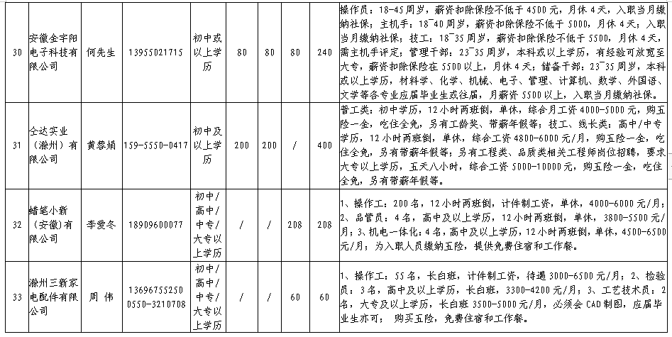 国家级滁州经开区企业2020年第一季度用工信息一览表
