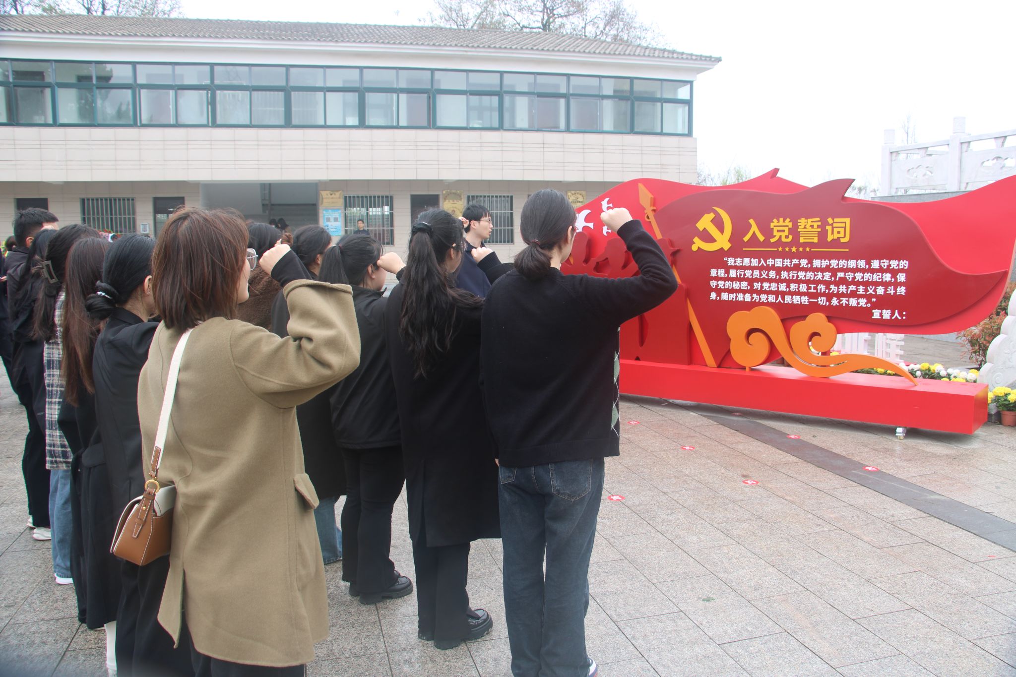 在纪念碑前,全体党员重温入党誓词,他们高举右拳,庄严宣誓:“我志愿加入中国共产党,拥护党的纲领,遵守党的章程,履行党员义务,执行党的决定,严守党的纪律,保守党的秘密,对党忠诚,积极工作,为共产主义奋斗终身,随时准备为党和人民牺牲一切,永不叛党。”