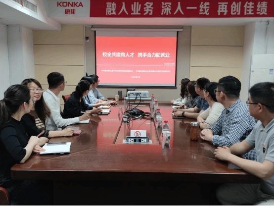 随后,双方围绕人才培养、学生实践、产教融合、党团共建等方面开展了深入座谈。座谈中,企业方首先介绍了企业的岗位需求和人才培养模式,学院师生分别从专业设置、共建课程、如何利用实习实践增强就业本领等方面与公司进行了深入探讨。康佳白电结合“红芯+我”党建品牌建设,分享实施“12345工程”的理念和经验做法,不断丰富和拓展党建品牌建设内涵,提升党建品牌的感召力、牵引力、生命力、凝聚力、保障力。双方共同就党建与业务工作如何双融双促展开了深入交流,并就下一步开展党、团支部共建活动进行沟通谋划。