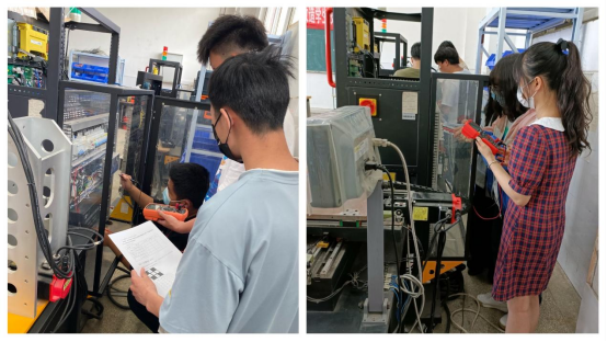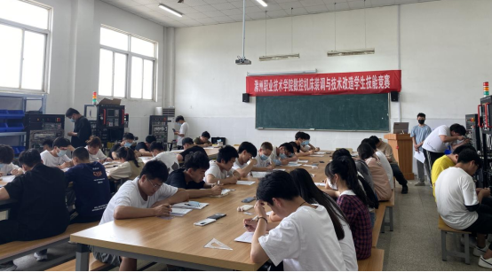 本次竞赛的参赛范围与对象为数控技术专业学生,为对接省赛、国赛要求,采取两人团队赛。竞赛内容包括理论考试及实际操作两部分,分别考核学生对于安全操作意识、电气设计与安装、线路安全检测与诊断和PMC程序设计能力。通过前期在20级、21级专业学生中广泛宣传和训练,学生们踊跃报名积极参与,最终组成32支队伍,分两个赛场同时进行,并邀请参加过省级选拔赛的19级老队员做为现场裁判员。
