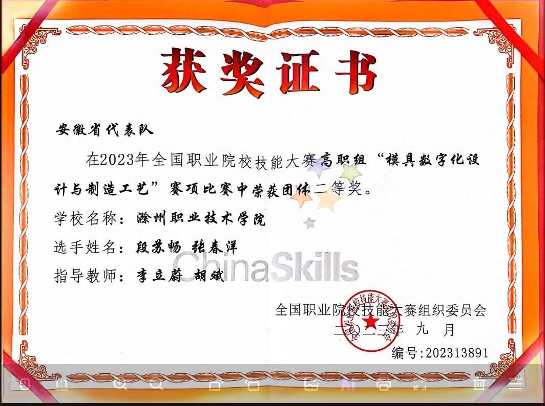 8月22日-25日,2023年全国职业院校技能大赛高职组“模具数字化设计与制造工艺”赛项在湖南工业职业技术学院拉开帷幕。来自全国各地56支参赛队伍的112名选手齐聚长沙同台竞技,awc官网学生模具专业学生张春洋、新能源汽车专业学生段苏畅组建的参赛队伍代表安徽省参赛,在教师胡斌和李立蔚指导下沉着应战,努力拼搏,以优异成绩荣获本次比赛二等奖。