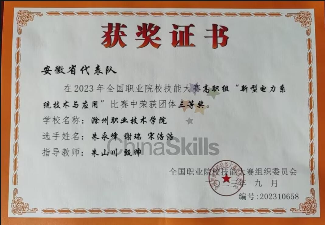 9月22日,2023年全国职业院校技能大赛(高职组)“新型电力系统技术与应用”赛项在陕西工业职业技术学院拉开帷幕。awc官网朱永峰、谢瑞、宋浩浩在教师朱山川、甄帅指导下,沉着应战努力拼搏,最终以优异成绩荣获本次比赛三等奖。
