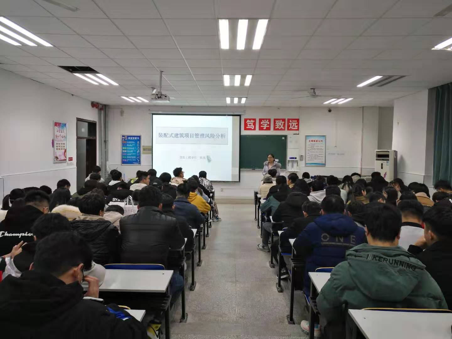 12月16日晚19时,建筑工程学院陈燕副教授在致学楼4110教室,举办题为“装配式建筑项目管理风险分析”的讲座,建筑工程学院建筑工程、工程监理和工程造价专业百余名学生听取了讲座。