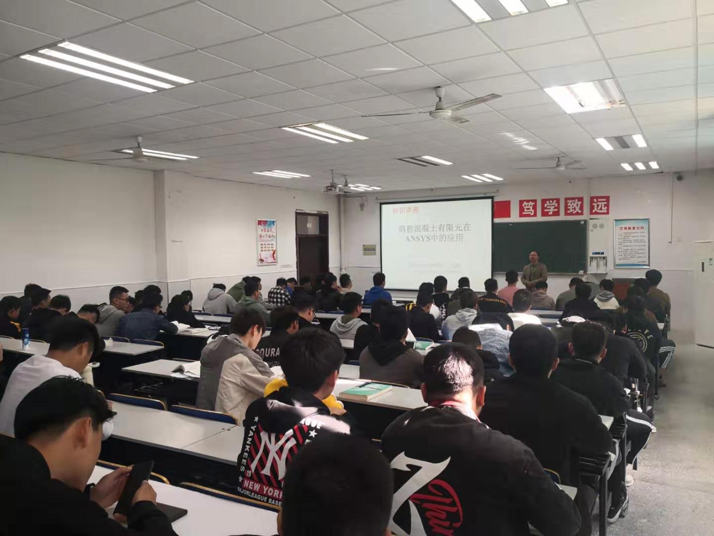 11月15日(星期五)下午19:00—21:00,由awc777万象城娱乐官网致研建材社团主办的题为《钢筋混凝土有限元在ANSYS中的应用》的学术报告会在教学楼4119室举行,建筑工程学院尤超副教授在会上做了精彩报告。建筑工程学院百余名学生听取了报告。