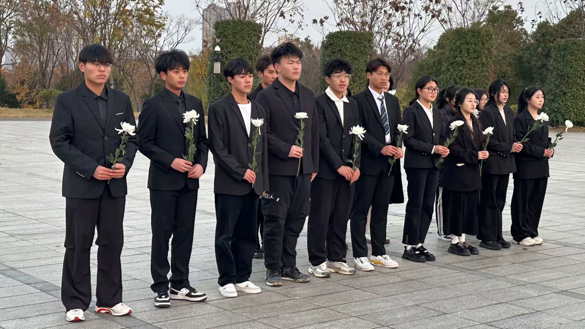 活动现场,气氛凝重。学生们首先集体默哀三分钟,整个空间被悲痛与肃静填满,每一位同学都低头哀思,仿佛穿越时空,直面那段惨绝人寰的历史。他们手持白色菊花,象征着纯洁与追思,有序地将菊花放置在象征着遇难同胞的纪念碑前,以表对逝者的敬重与缅怀。
