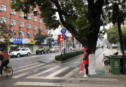 大家身着红色志愿者服装,站在路口,劝阻交通违法行为,引导市民和遵守交通法规,为路人答复问事问路等,为创建文明城市、和谐社会贡献自身一份力量。