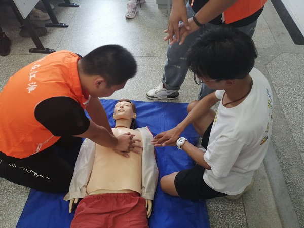 院红十字会会员向大家讲解了心肺复苏、创伤救护、排除气道异物等基本知识,并现场进行了实际操作方面的培训。同学们学习的热情很高,边听边练,增强了自我保护和救助他人的能力。