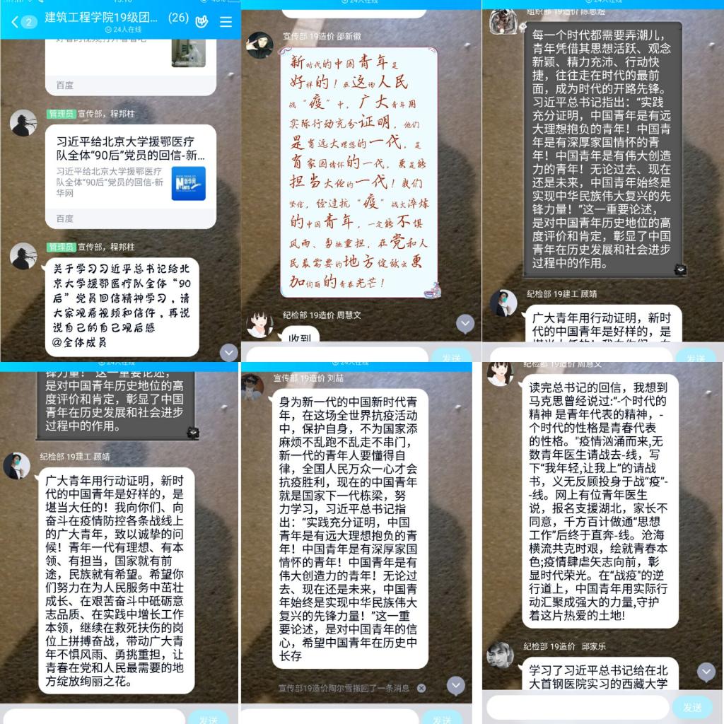 4月21日上午,建筑工程学院团总支于线上组织“关于学习习近平总书记给北京大学援鄂医疗队全体“90后”党员回信精神学习活动”。
