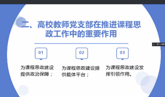 工程造价专业负责人管红兵老师以承担的《工程招投标与合同管理》课程为例,深刻阐述了课程思政建设的意义、作用以及党支部在推进课程思政建设中的作用;支部书记闫秀芳老师以《建筑工程计量与计价》课程为例,针对45分钟的课堂教学,梳理挖掘了课程中潜在的思政元素,直观展示了课程思政资源的挖掘过程,为专业课教师的课程思政建设提供了参考和依据。