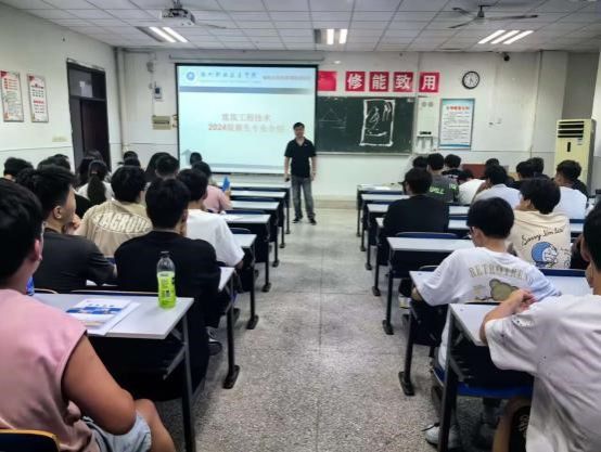 建筑工程学院开设建筑工程技术、工程造价、建设工程监理、建筑装饰工程技术、道路与桥梁工程技术和现代物业管理这六个专业。建筑工程学院紧跟时代步伐,与时俱进地开设一系列课程,为同学们提供高质量的教育教学服务。各专业派出优秀教师向2024级新生详细地介绍了各专业的优势和机遇以及实训条件、师资力量、技能大赛、校企合作单位等情况,并在最后对2024级新生寄予殷切的期待与希望,在今后的学习生涯中应严格要求自己,学好专业知识,提升综合素养。
