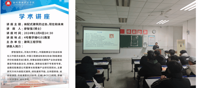 2024年12月4日下午,校外专家廖智强博士在4号教学楼4101教室,举办了主题为“装配式建筑的过去、现在和未来”的讲座。建筑工程学院师生聆听了廖博士的精彩分享。