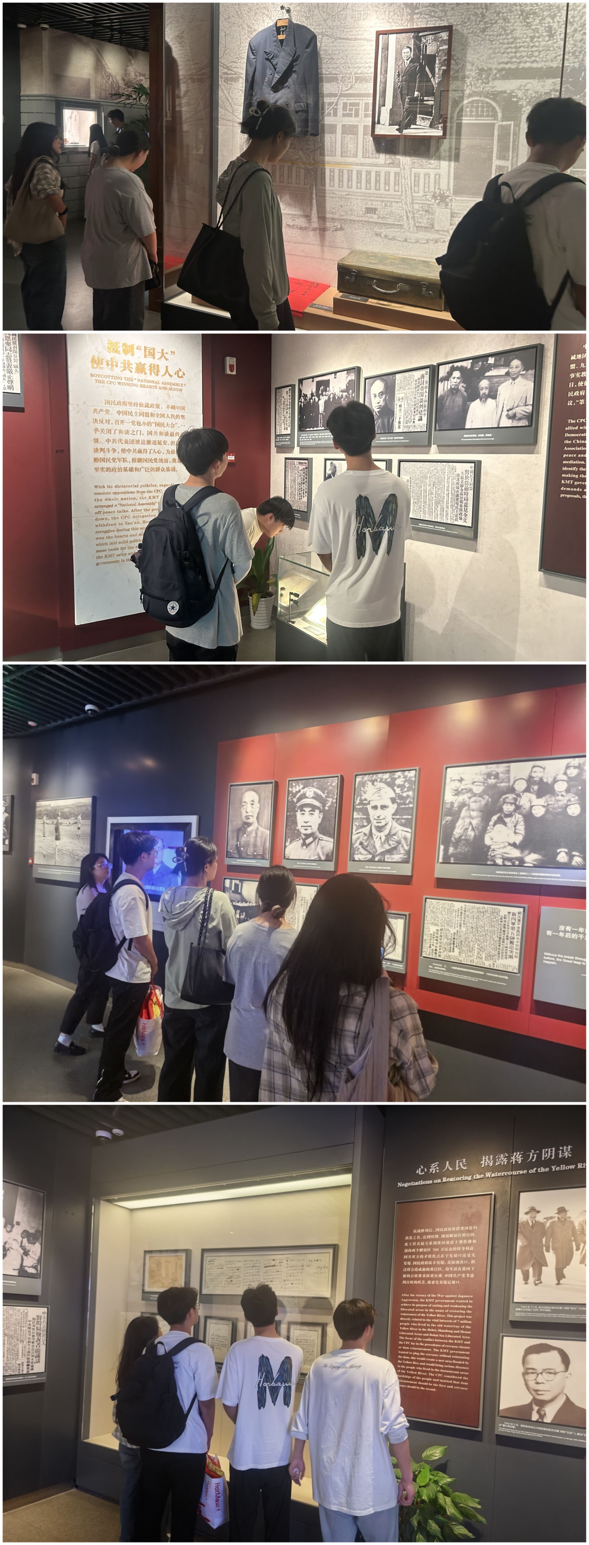 实践团队成员首先参观了代表团办事处旧址。青砖灰瓦的建筑群落中,办公室、卧室、会议室等场景被完整复原:周恩来同志使用过的办公桌、泛黄的谈判手稿、简陋的木床…… 每一件文物都在无声诉说着当年共产党人在艰苦环境中坚持斗争的坚韧品格。展厅内多媒体互动装置还原的谈判场景,更让同学们“身临其境” 感受历史抉择的沉重与伟大,深刻理解“没有共产党就没有新中国”的历史必然。