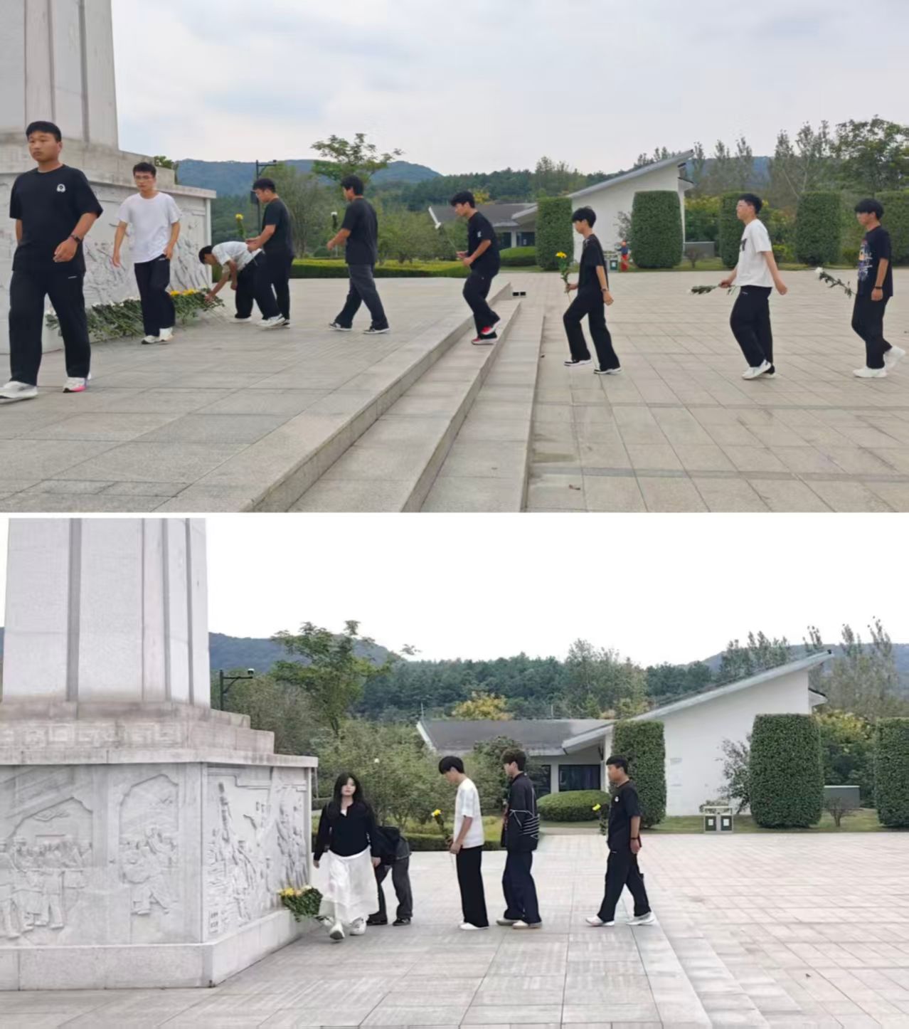 活动当日,师生们怀着崇敬的心情来到烈士陵园。在学院学生代表李焜的主持下,纪念活动正式拉开帷幕。低沉的哀乐声中,纪念活动进入默哀环节。全体师生低头肃立,默哀一分钟。时间仿佛在这一刻静止,每个人的心中都充满了对先烈的追思 —— 正是这些无名英雄们在烽火岁月中挺身而出,用鲜血与生命换来了如今的和平与安宁。默哀结束后,师生代表们依次上前,手持洁白的菊花,轻轻放在纪念碑基座旁。一朵朵菊花,象征着纯洁与敬意,也承载着新时代青年对先烈精神的传承之志。