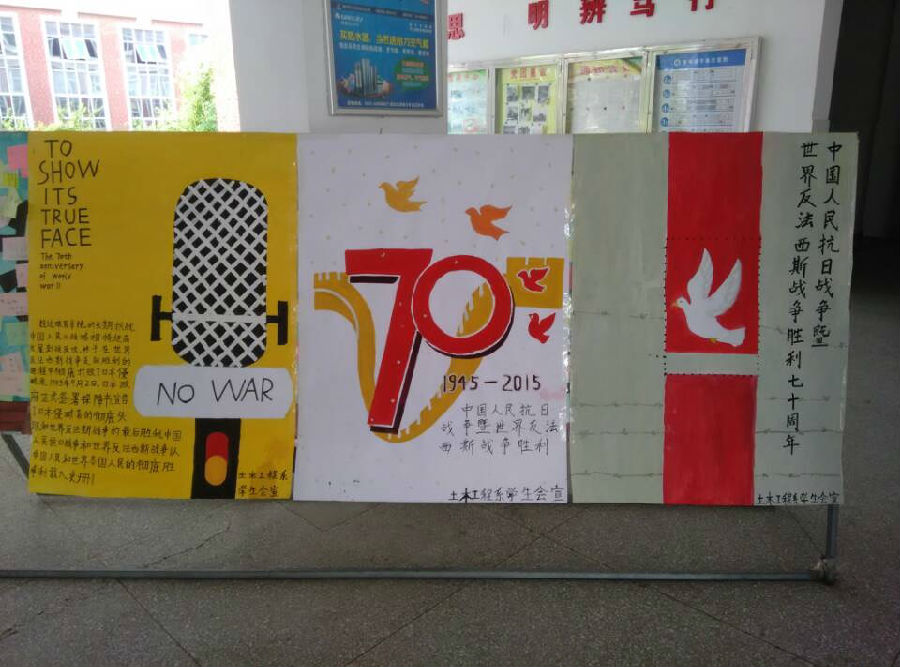 其中,土木系学生会的同学们就集思广益,构思绘制出了三幅彩色海报在系教学楼大厅的展板上展览,让抗战胜利的伟大意义深入人心。纪念抗战胜利70周年,既能增强青年学生和团员们的爱国意识、提高全系的的凝聚力,还可以促进同学们在将来的学习和工作中奋勇争先,为学院和系部的发展贡献力量。