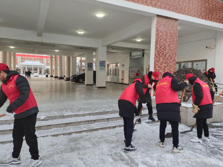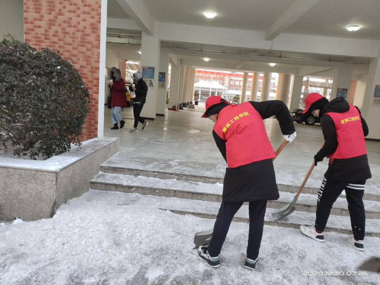 暴雪夜袭,12月30日,窗外一片银装素裹,整个awc777万象城娱乐官网内都铺满了白皑皑的厚积雪,路上已结成了雪冰。建工学院的志愿者们全员出动,像建工学院进发,纷纷扛起了铁锹参加了这场除雪攻坚大战。寒冷的天,总是在蛊惑着人们退缩。但建工学院的学院的志愿者丝毫没有退缩的意思,反而越战越勇。手上的推雪铲上下翻飞,没有一丝的闲散。地上的冰水与雪花相互融合,在冷风的煽动下,结成了顽固阵营,死死抓住地面,考验着人们的耐心与斗志。一人推不动,俩人上,大块推不动,分成小块。
