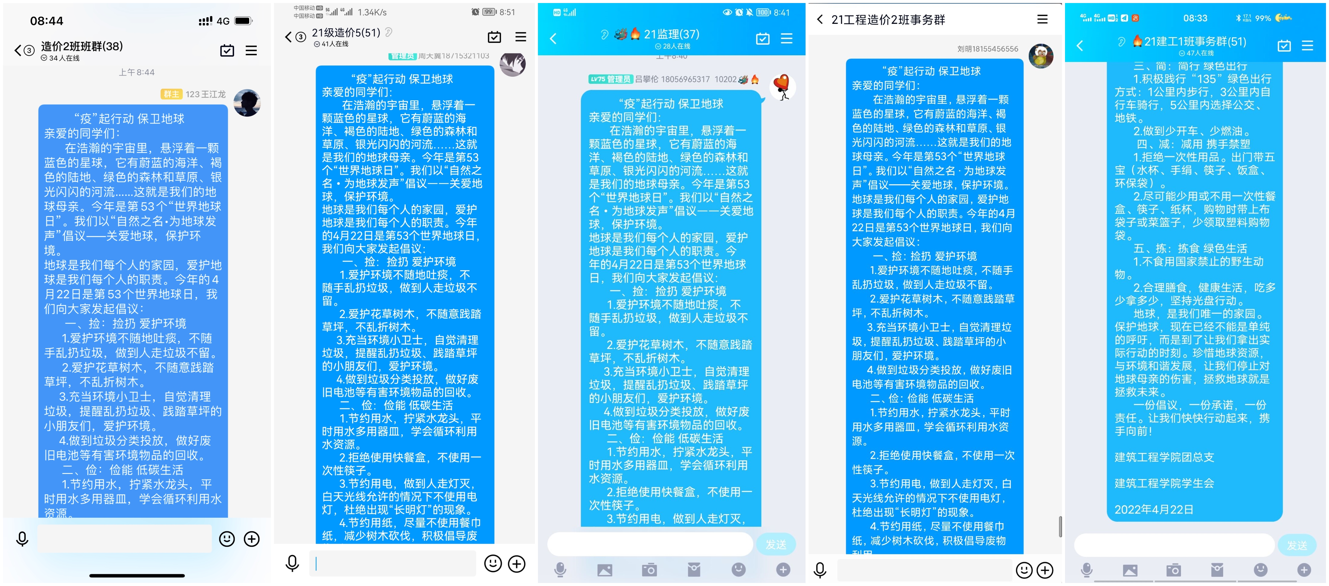 学院团总支、学生会通过班级群、学生干部群、主题团日活动等方式线上线下为保护地球发出倡议,号召同学们参与环保,与环保同行。倡议书中阐述了保护地球环境的重要性,引导同学们积极参与到节约资源,绿色生活的行动中来,共同呵护人类共同的家园。此次倡议的发出,提高了同学们的环保意识,取得同学们的支持。