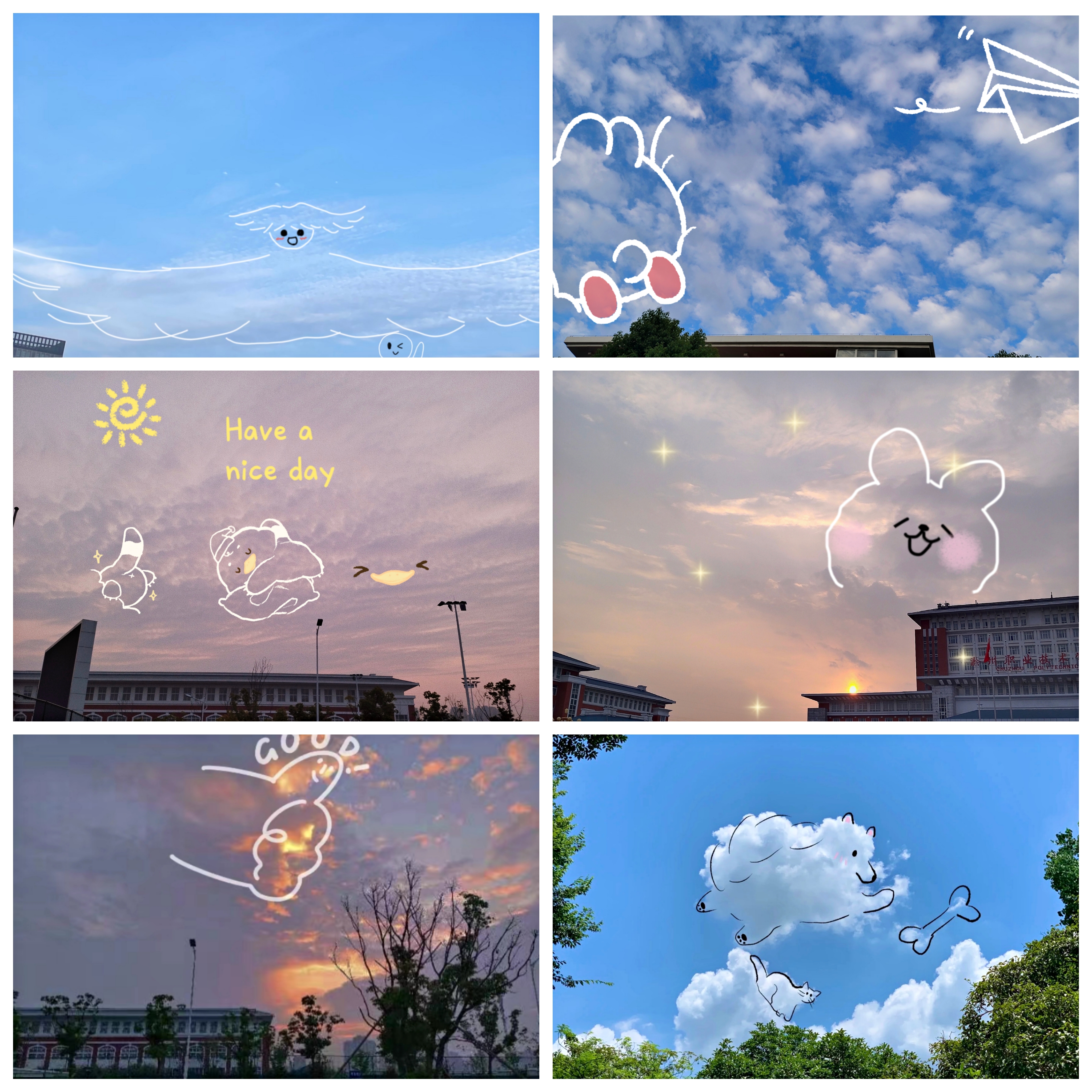 活动发出,同学们都踊跃参与。积极举起手机定格下校园内天空的独特瞬间,利用美图秀秀、醒图、ps等修图软件在拍下的照片上进行绘画涂鸦。抬头、定焦、成像,画笔轻描,云朵便有了更加具体有趣的模样,每一朵云朵都有着它们不一样的故事,同学们用各自独特的视角,描绘着心中最美好的画卷,用独具匠心的构思与创意,让创意的翅膀在云朵中遨游。
