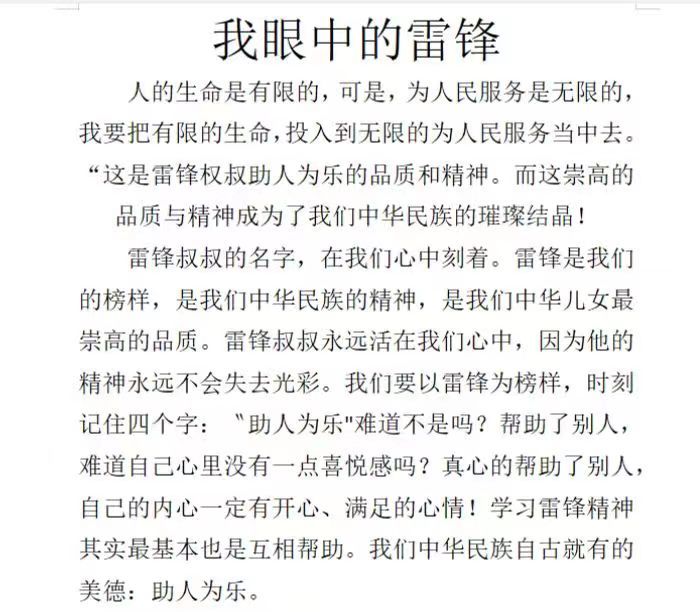 活动中同学们从多角度深刻解读自己眼中的雷锋,写出同学们的真情实感,或详细地阐述雷锋精神的意义,凸显雷锋高大形象,鼓励我们向雷锋同志学习;或联系现实社会,指出我们的生活中缺少雷锋精神,我们应该增强弘扬雷锋精神的意识;或介绍身边的好人好事,充分反映同学们“奉献、友爱、互助、进步”的优秀品质。