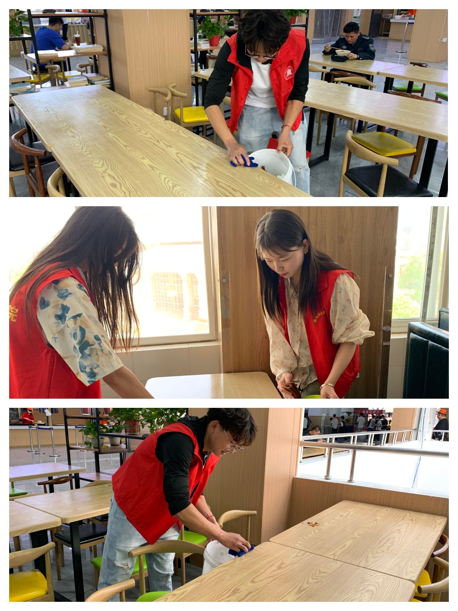 志愿者们通过帮助他人,锻炼了自己,同时也提高了社会责任感和实践能力。用实际行动为同学们送去了洁净与温馨,营造良好的就餐环境,为构建文明的校园环境献出了自己的一份力量。