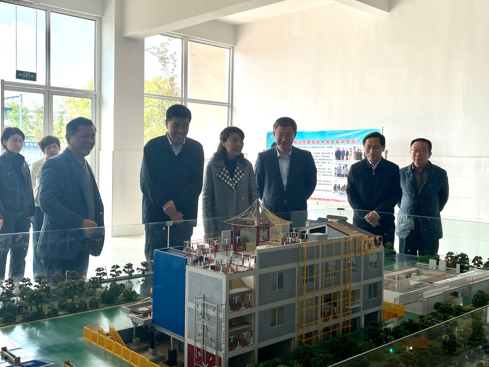 汪建中一行对建筑技术综合实训馆进行了实地考察。朱永祥对建筑技术综合实训馆的功能、运行情况、建筑工程学院专业、师资队伍、实验实训建设、校企合作以及“1+X”BIM和建筑识图实训室建设和对外培训的开展情况进行简要汇报。