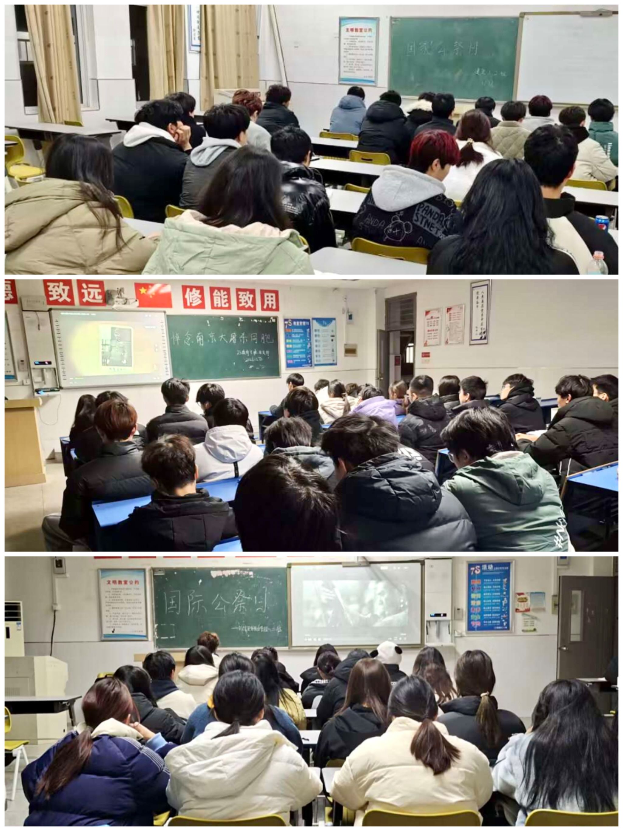 国家公祭日主题班会是学校教学中的一项重要活动。活动中有些班级采用PPT的方式为同学们介绍国家公祭日,也有些班级为大家播放有关于国家公祭日的电影或视频。我院还举行了纪念活动与仪式,比如:向英烈献花、默哀、举行纪念会、进行庄重的悼念仪式等。这些活动无一不表达对英烈的敬意和纪念,更是对历史事件的追思和铭记。更有利于唤起同学们对历史事件的思考和反思,坚定民族精神,促进社会团结,并且提醒同学们不要忘记这些痛苦的经历和教训。时刻激励同学们为创建一个和平、安全的世界而努力奋斗。