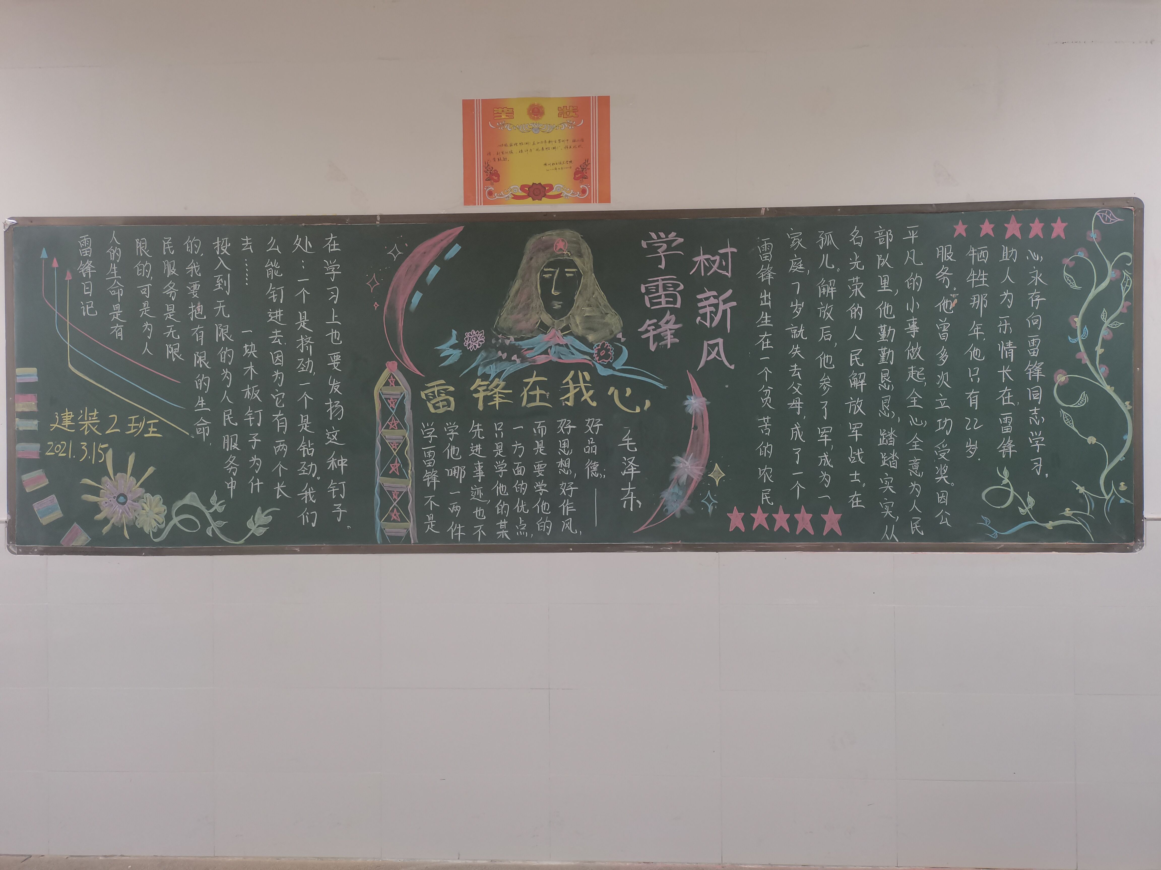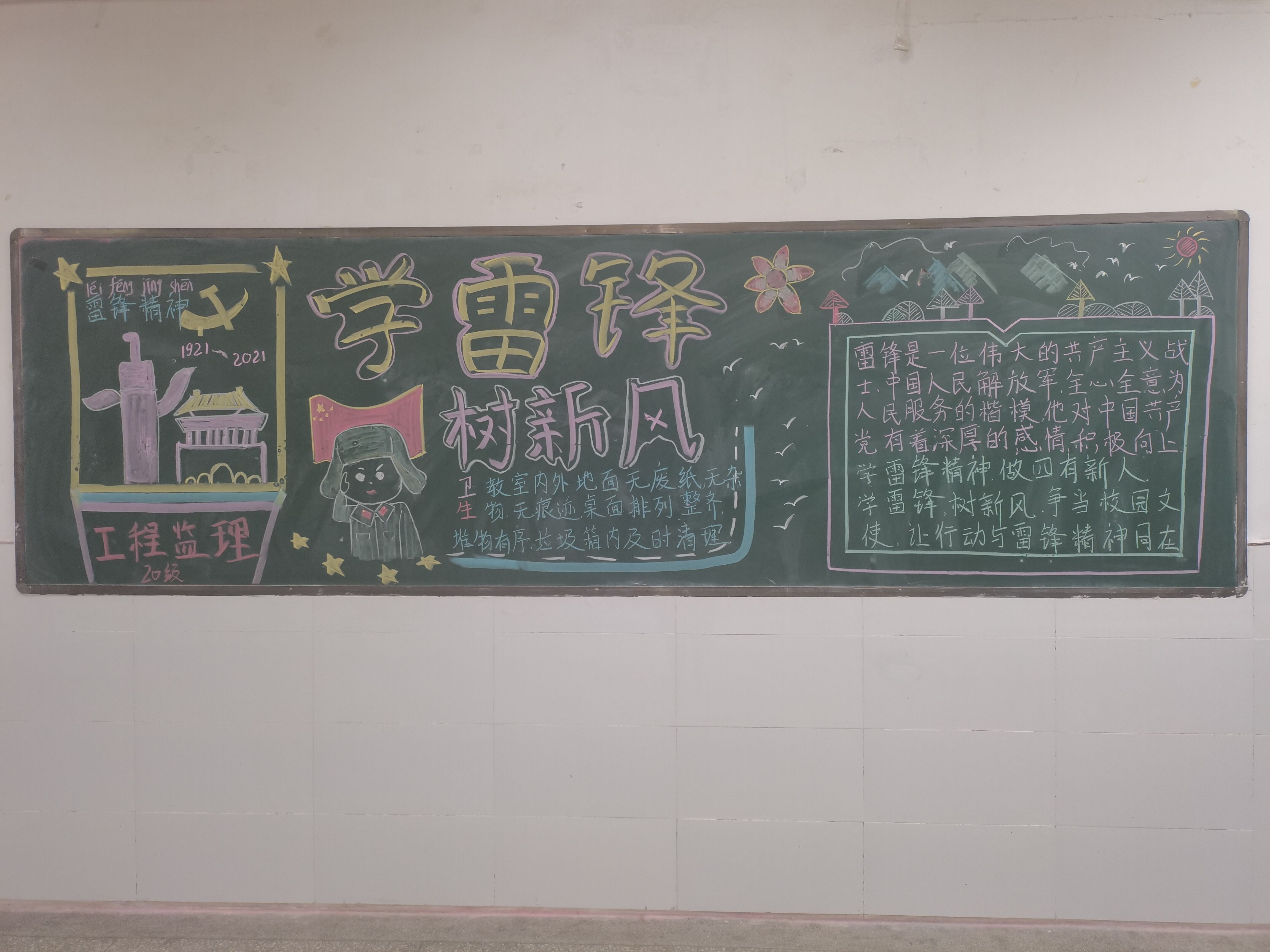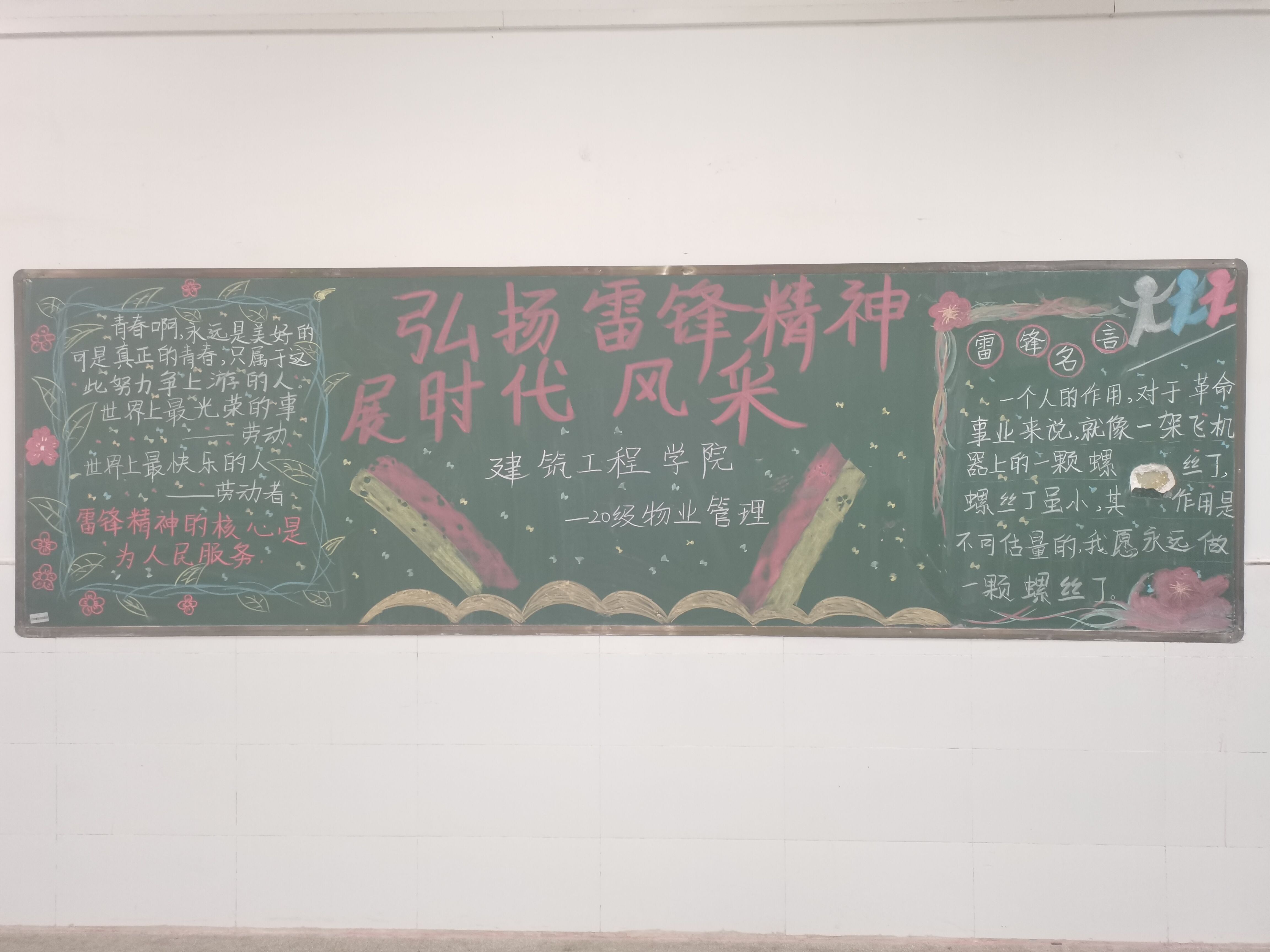 为传播雷锋精神,丰富校园文化,展现学生风采,3月22日,建筑工程学院开展以“传承红色基因 弘扬雷锋精神”主题黑板报评比活动,旨在宣传雷锋短暂但永恒的人生,弘扬雷锋精神,争当时代先锋。让雷锋事迹,雷锋精神,伴随春风传遍校园。