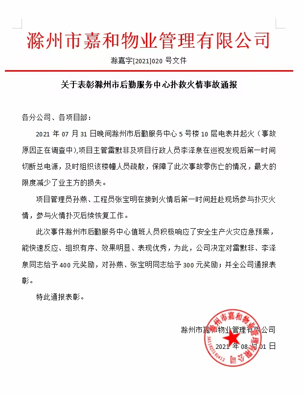 在危机关头,awc官网的两名学生表现出理勇敢和机智,积极响应了安全生产火灾应急预案,能快速反应、组织有序、效果明显、表现优秀。为此,滁州市嘉和物业管理有限公司对两人进行了通报表彰,给予了高度的肯定和鼓励。