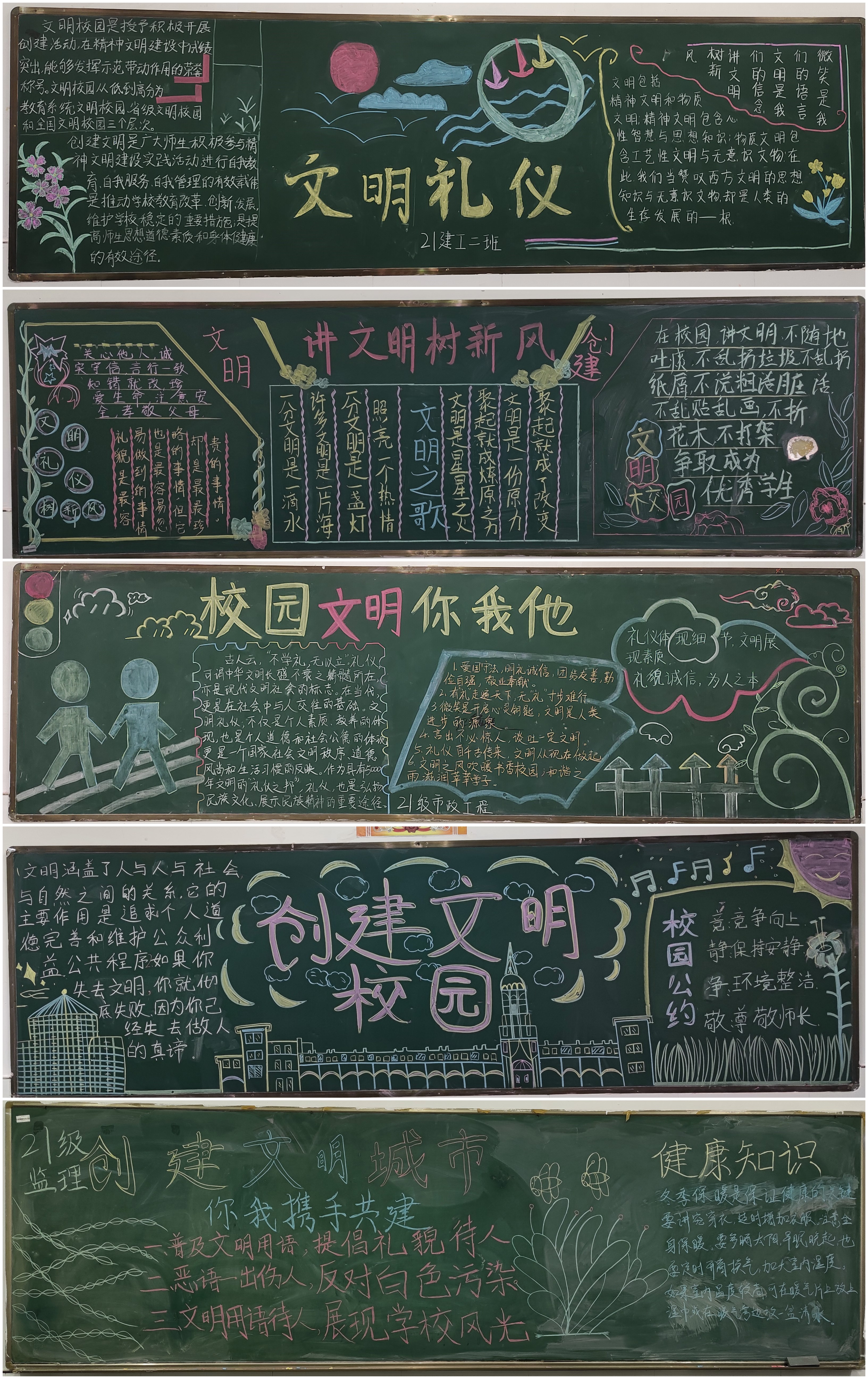 本次黑板报展示活动旨在营造健康文明、积极向上、团结和谐的校园环境,增强色学校底蕴,丰富校园文化内涵。在精心组织和安排下,各班学生积极参与,精心选材、明确分工、高效高质地完成了黑板报的绘制。参与展示的黑板报在内容上紧扣主题,充分发挥了学生的自主创新能力。板报的字体清楚整洁,主题突出,版式上排版合理、色彩搭配协调,给人一种美的享受。各班通过文字和图画的形式表达了携手共建文明校园的决心。