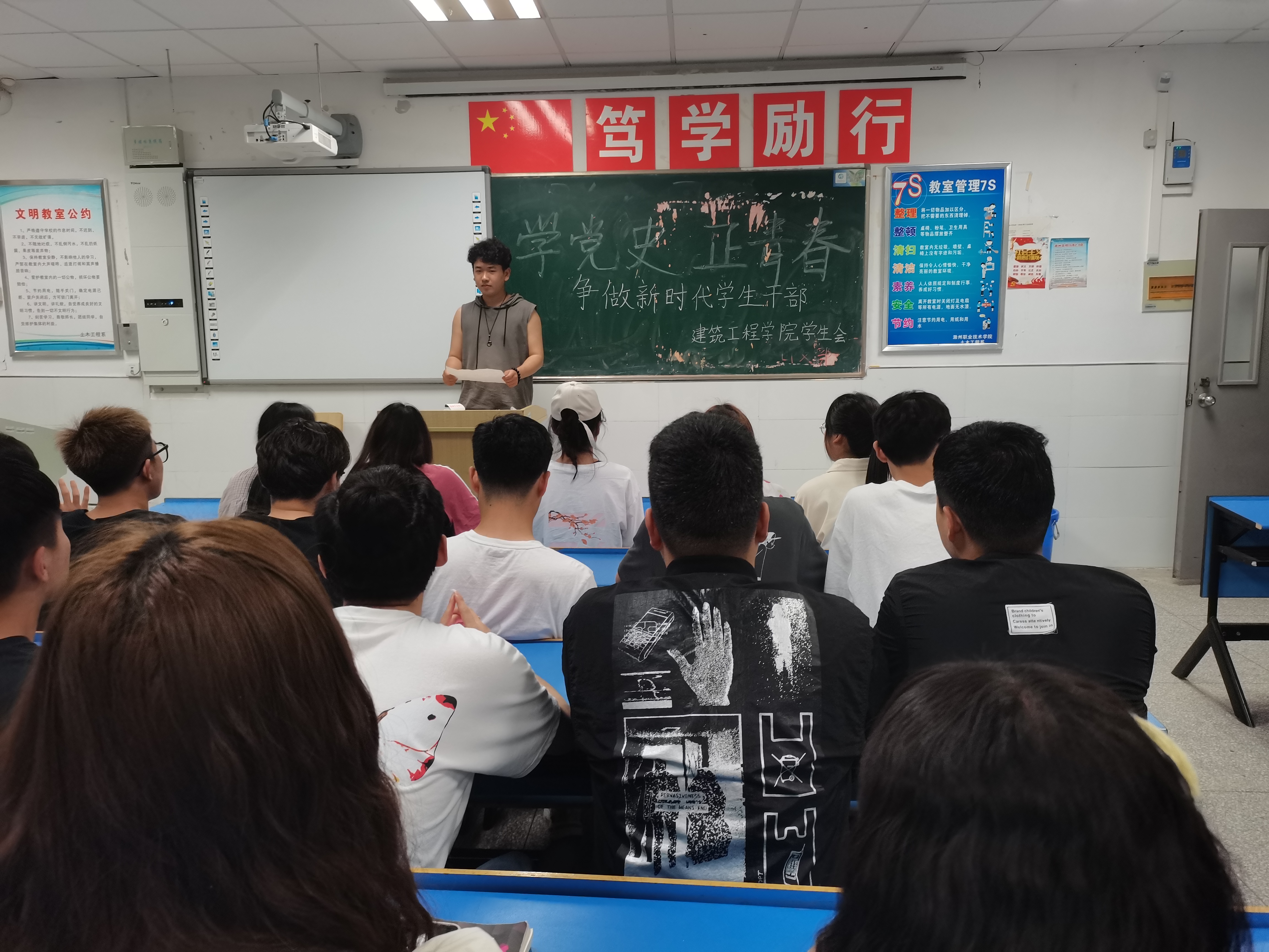 会上同学们共同学习了党史、习近平总书记致全国青联十三届全委会和全国学联二十七大的贺信内容、中华全国学生联合会成立100周年以及关于学生会工作人员改进作风服务同学的若干规定。院学生会主席毛云浩向学生会干部提出,要坚持以“服务同学,奉献建工”为宗旨,不断提升服务意识,充分利用在团学组织锻炼的机会,更好地投入学校发展建设中。
