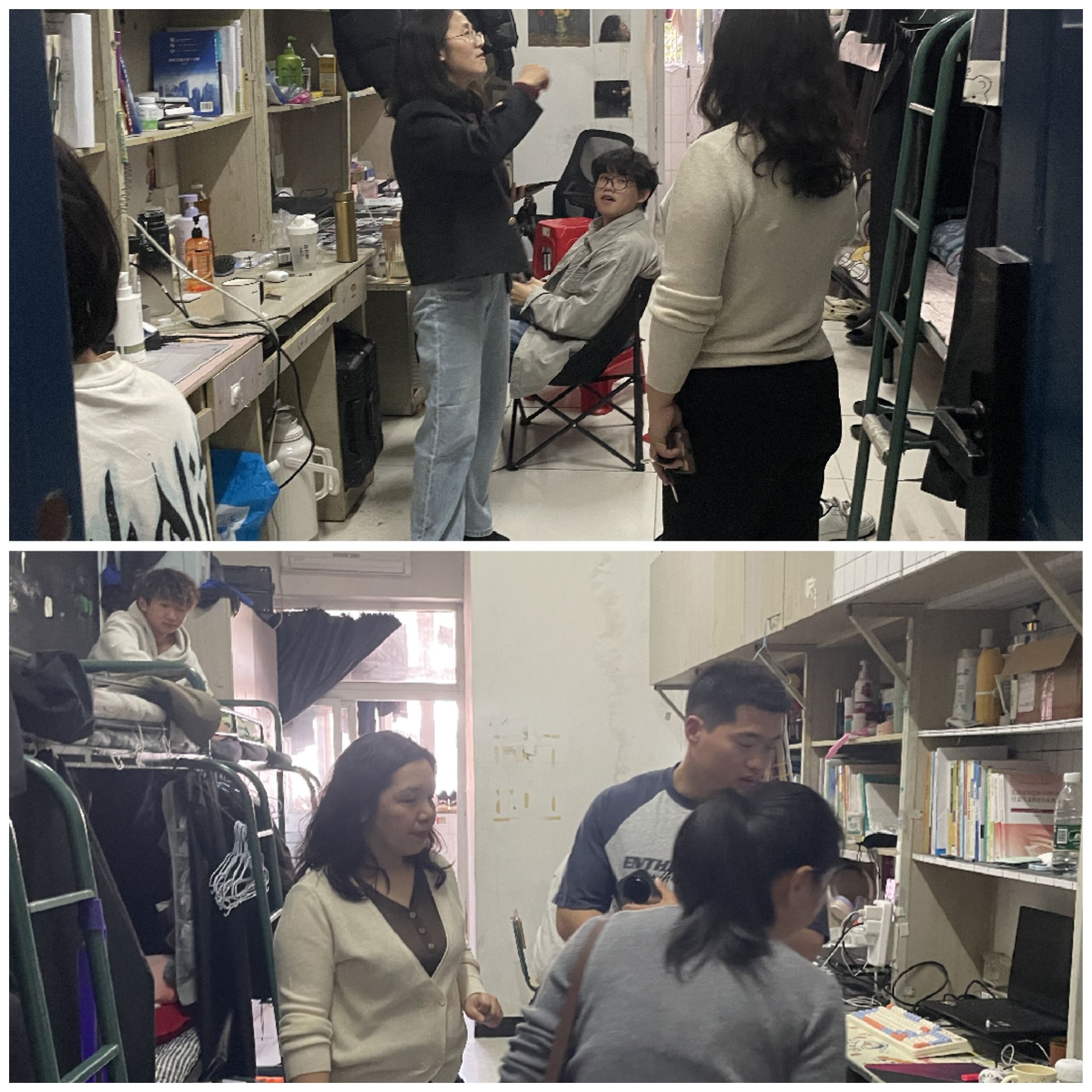 会后,程毓带领专职辅导员走访学生宿舍,并与同学们亲切交谈,询问大家的日常生活情况,在交流中,老师们也不忘提醒同学们合理安排作息时间,保持宿舍卫生,注意用电安全,共同营造和谐、文明的宿舍氛围。